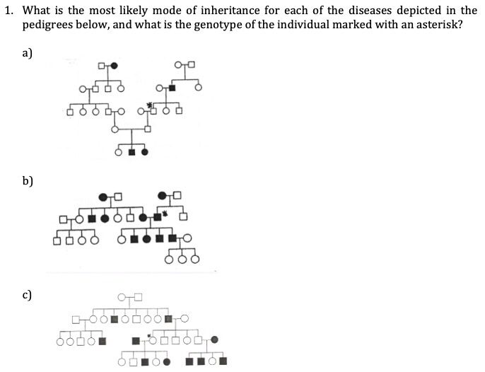 If you are unfamiliar with pedigree charts or mendelian genetics, a series of questions until you determine the inheritance pattern. This type of inheritance pattern is a mixture of both traits. (red + white mode of inheritance pedigree quiz = pink) q. colorblindness is a recessive, x chromosome sex-link disorder. cross the parents to figure out which percentage of their offspring will be colorblind. q. this type of inheritance pattern shows both traits in possible offspring. q. Consider the following pedigrees, all involving a single trait. briefly explain for each case whether any of the following modes of inheritance can be .